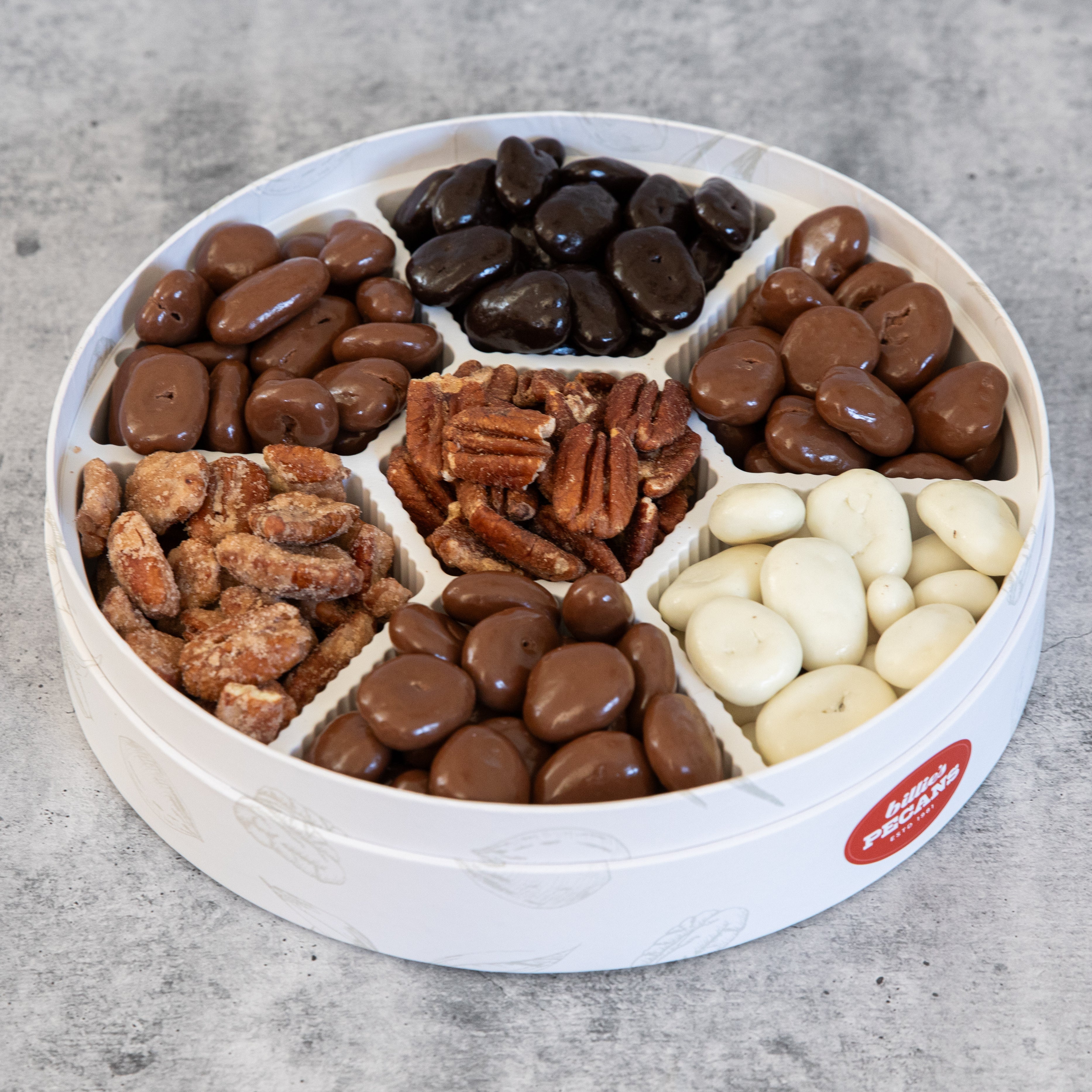 Our 7-Way Sampler includes: Chocolate Amaretto, Chocolate Grand Marnier, Cinnamon Spiced, Dark Chocolate, Milk Chocolate, White Chocolate and Toasted Pecans