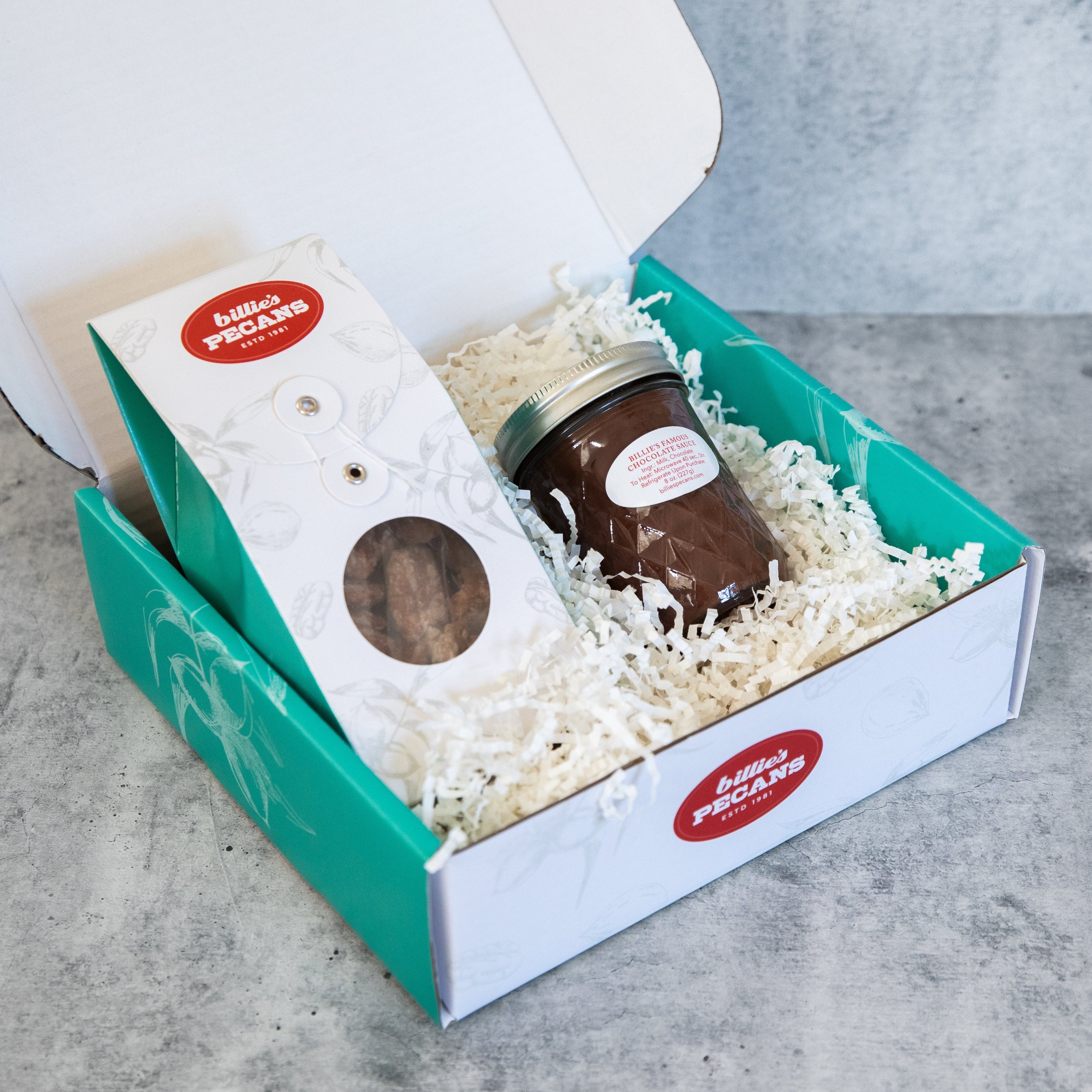 We've combined our signature Cinnamon Spiced Pecans with our crave-able Chocolate Sauce—a true dippin' delight! This gift-ready combo is the perfect way to say "thanks" or to just enjoy while watching a movie!