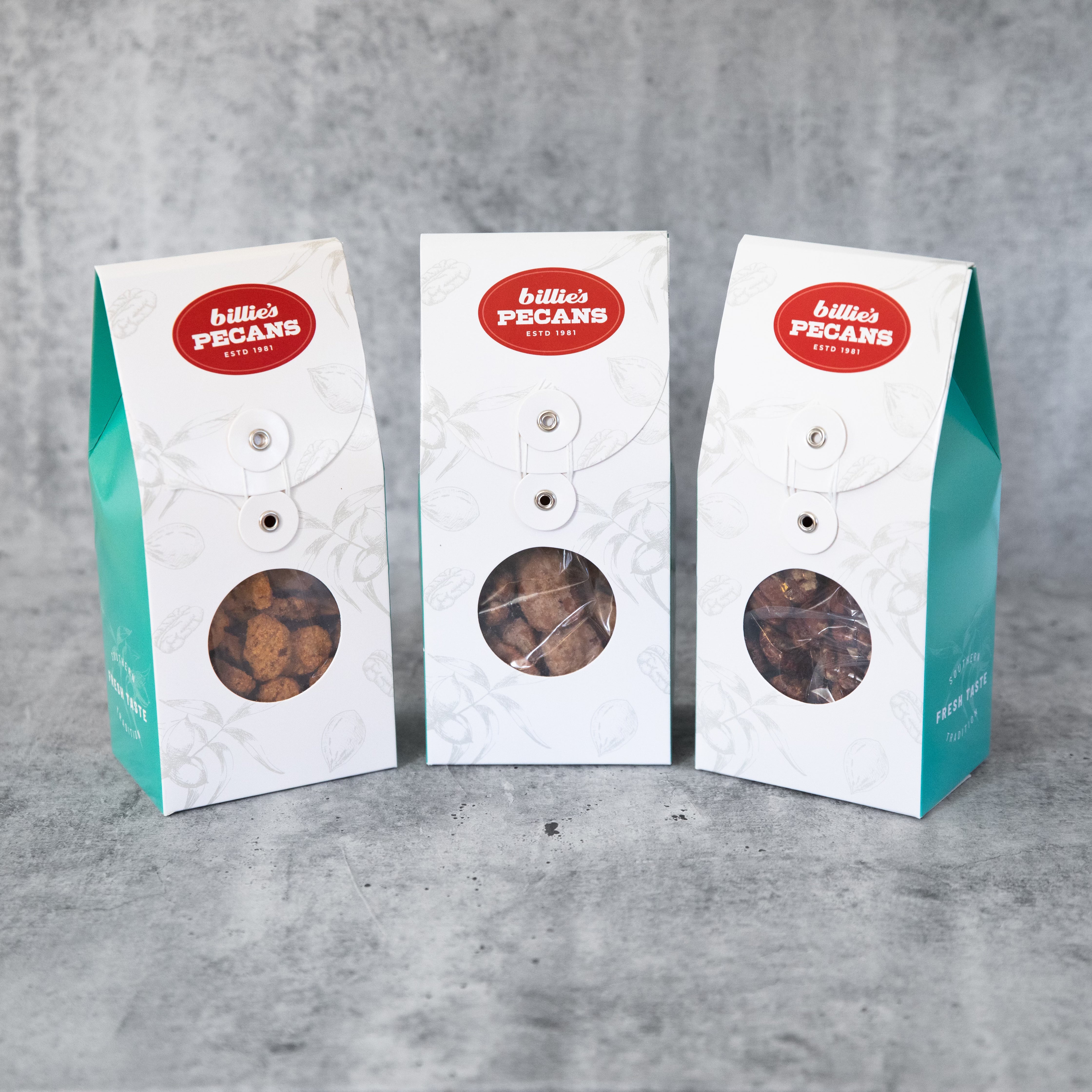 Three of Billie's best—and they make the perfect gift! Enjoy an 8 oz. gift bag each of Cinnamon Spiced Pecans, Toasted Pecans and Cheese Crispies.